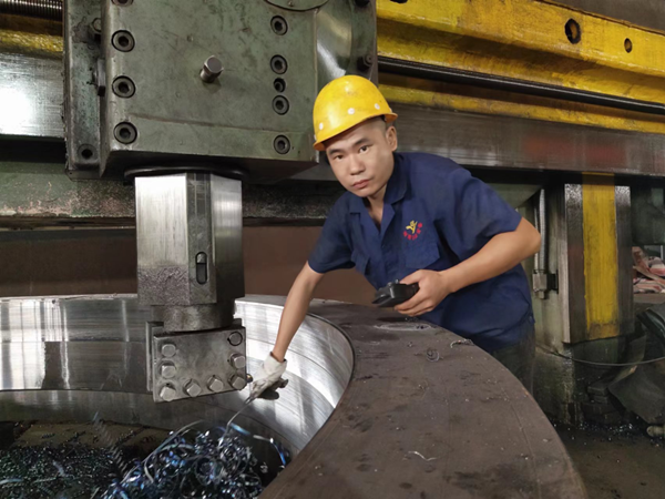 他為人憨厚老實(shí),吃苦耐勞,服從安排,任勞任怨,做事專注細(xì)致,被張主任看在眼里記在心里。因此當(dāng)8米立車一名師傅辭職后,他便按照“量才配崗”的原則,立即把趙江調(diào)到立車崗位,每天親自教他操作立車。通過他的嚴(yán)格要求,加上趙江堅(jiān)持不懈的努力,他終于熟練掌握了立車的操作技術(shù)。如今,他在立車崗位上己經(jīng)做了兩年,前后己帶了兩位徒弟。每當(dāng)同事夸他上手快時(shí),他卻覺得自己的技術(shù)離師傅還有很大差距?!凹埳蠈W(xué)來終覺淺,絕知此事要躬行。張主任的親自教導(dǎo)、我從書本上自學(xué)來的知識(shí),自己按條條框框操作,這是打基礎(chǔ)。領(lǐng)悟了圖紙的加工要求后,在保證質(zhì)量的前提下,編寫好程序、各項(xiàng)參數(shù)、速度(包括進(jìn)給速度和轉(zhuǎn)速)后,我還必須隨時(shí)觀察車床上的一舉一動(dòng),監(jiān)管加工全過程,在工作實(shí)踐中不斷發(fā)現(xiàn)問題、思考問題、解決問題、總結(jié)經(jīng)驗(yàn)。當(dāng)我能對(duì)具體問題具體分析具體解決并游刃有余時(shí),我就從操作工變成師傅了,”趙江說。