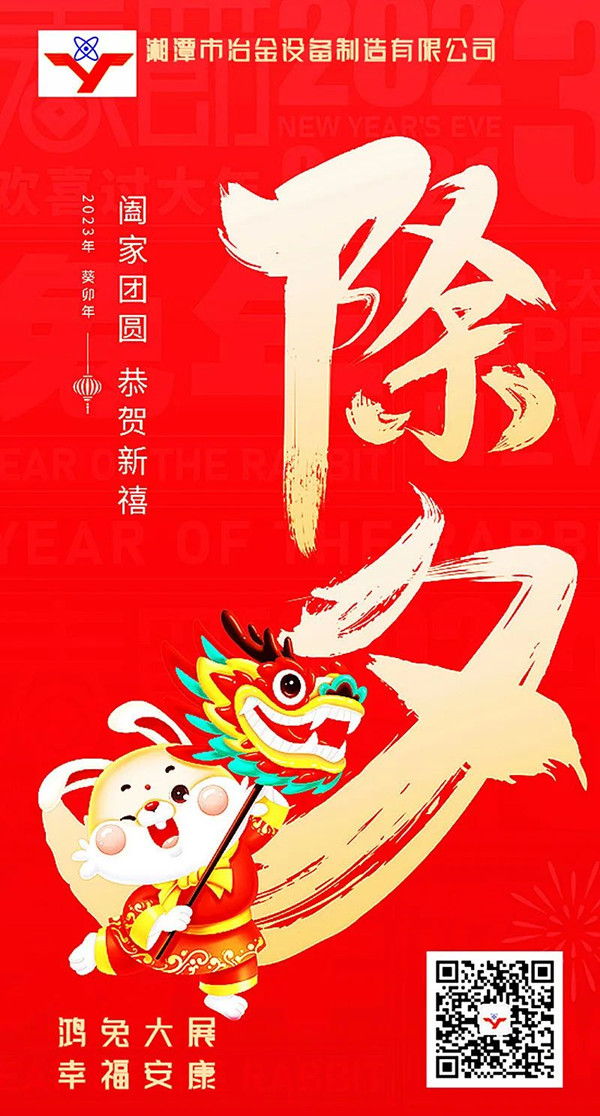 ”爆竹聲聲一歲除,歡天喜地迎新春“。在震天的鞭炮聲中,在滿天璀璨的煙花里,我們與2022揮手告別,與嶄新的2023年深情相擁……陪伴是最深情的告白,相守是最溫暖的承諾。除夕之夜,最大的幸福莫過于和家人團聚,最大的快樂莫過于陪父母長輩談心,最好的祝福就從湘潭市冶金設(shè)備這里傳遞……值此農(nóng)歷除夕到來之際,國內(nèi)冶金礦山設(shè)備非標定制專家——湘潭市冶金設(shè)備制造有限公司衷心祝愿所有客戶、伙伴、朋友、家人們:除夕團圓! 新年歡喜!鴻兔大展! 萬事如意!祝天下所有父母:健康長壽,平平安安!祝天下所有家庭:溫馨和睦,幸福美滿!