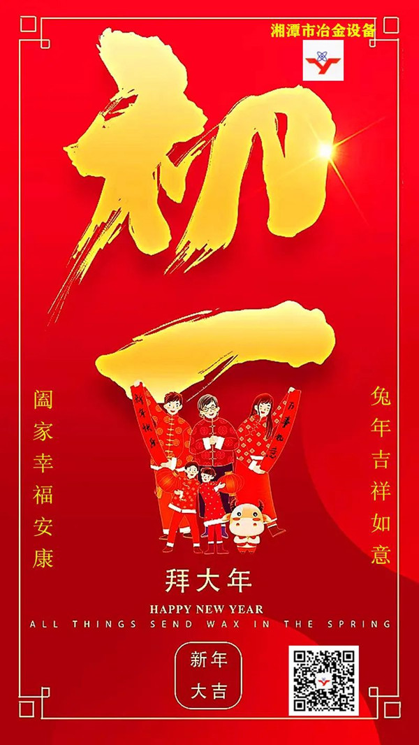 金虎呈歡辭舊歲,福兔躍起迎新春。 湘潭市冶金設備發(fā)展、成長的每一步,都凝聚了各位客戶、合作伙伴和各界朋友的關懷、信賴與支持,以及全體湘冶家人的辛勤耕耘與打拼。充滿機遇與挑戰(zhàn)的2023,我們將信心滿懷,堅守初心,沿著既定的宏偉目標,再譜新篇章。 值此兔年春節(jié)到來之際,國內(nèi)冶金礦山設備非標定制專家——湘潭市冶金設備制造有限公司恭祝大家:春節(jié)團圓美滿!闔家幸福安康!在大展鴻兔、兔飛猛進的2023年里,好運常在!笑口常開!開心每一秒,快 樂每一天,幸福連連,健康久久!